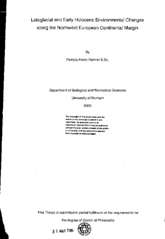 Palynological studies from two lacustrine sites, Lochan An Druim in northern Scotland and NikkupierjaVri in northern Finnmark, have demonstrated quantitative changes in the vegetation of the northwest European continental margin, following deglaciation (са 16.0 - 7.5 ka BP), and these changes have been correlated with the short term fluctuations and rapid changes in climate as recorded in the GRIP ice-core record. It has been shown that the palaeovegetation profiles from these sites, near to the potential extremities of northward penetration of warm ocean surface water during this time have recorded some of these events differentially, indicating a northward lag in response to Holocene warming that is not temporally consistent, and this has been attributed to the relative proximity of the North Atlantic Polar Front. เท addition, evidence is presented for a previously unrecorded early Holocene Icelandic cryptotephra from Lochan An Druim, together with evidence in support of a 'Younger Borroboľ cryptotephra from Lateglacial sediments of Allerød age at the same location.