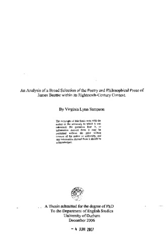 An analysis of a broad selection of the poetry and philosophical prose of James Beattie within its eighteenth-century context.