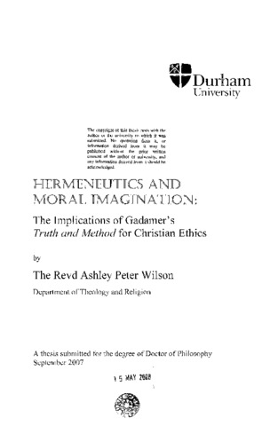 This study considers the implications for Christian ethics of the work of Hans-Georg Gadamer (in particular, his hermeneutics as presented in Truth and Method). The adequacy of moral deliberation based on autonomous moral reasoning to complex dynamic situations is challenged, as is the Enlightenment conception of abstract, universal rationality. Two mąjor theses are proposed. First, that ethics (including Christian ethics) should adopt a stance that is properly hermeneutical: taking proper account of ethics' embeddedness in history and tradition; and abandoning hope of a universal or objective standpoint from which to make ethical judgements. Second, that human beings are fundamentally imaginative moral beings: imagination is central to ethics because it is central to language and reason. Legalism and utilitarianism are critiqued as examples of the dependence of ethics on notions of absolute truth and universal method. Gadamer’s Truth and Method is considered, highlighting areas of relevance to ethics. In response to Gadamer’s observations on the centrality of language to hermeneutics, the work of Mark Johnson in cognitive science is explored in detail. The centrality of imagination to moral reasoning and to conscience is noted; and parallels are drawn between conscience and taste. It is proposed that a proper emphasis on the metaphorical nature of moral language, together with a notion of reason (and of moral deliberation) that is essentially imaginative, accord better with the phenomenology of ethical deliberation than the traditional accounts and also allow for more flexible responses. The implications of Gadamer’s hermeneutics and Johnson's moral imagination for Christian ethics are explored in relation to creation, incarnation, revelation and inspiration. The study concludes that a properly hermeneutical Christian ethics would allow a greater role for the imagination in moral deliberation and provide a system which is flexible, creative, and humane, and which properly reflects the goodness and beauty of God.
