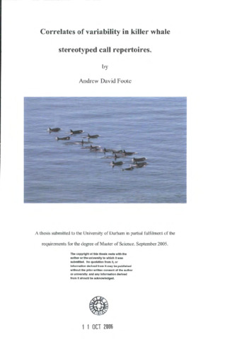 Killer whales vocalisations include repertoires of stereotyped call types (Ford 1984). There is strong evidence that these vocalisations are learnt (Hoelzel and Osborne 1986; Bain 1989; Deecke et al. 2000; Yurk et al. 2002). Call types can be group specific or shared amongst a number of groups, depending upon the social structure of the population or the call type (Ford 1991; Deecke 2003). It is thought that these call types function in the group cohesion and coordination (Hoelzel and Osborne 1986; Ford 1989 1991; Miller 2000, 2002). Some call types contain two overlapping, independently modulated, components each having different transmission properties (Miller 2002), these call types have a higher estimated active space than single- component call types (Miller 2006).This thesis investigates the evolution of these call type repertoires, focusing on call type usage and structure of the Southern Resident population over a period of 27 years, but including comparisons with other populations. I present evidence of hetero-specific mimicry and further evidence for vocal production and usage learning in killer whales. I compared the relative frequency of use of call types between two time periods (1977-81 & 2001-2003) and between contexts, such as direction changes with directional travel and multi-pod aggregations with single pods. I found a strong correlation of relative call type usage for each pod between the two time periods and each pod was easily acoustically distinguishable from the other two pods in both periods. The implications of these results for a role of call type repertoires in kin recognition are discussed. The least cohesive pod produced a significantly higher proportion of two-component call types than the other two more cohesive pods. Lone whales separated from their pod also used a rare subset of two-component call types rather than their pod's main call types. In recordings of multi-pod aggregations I recorded a high proportion of the same subset of two-component call types not commonly produced by any of the three pods individually, these call types were used in significantly higher proportions when all three pods were converging or socialising rather than travelling. These contextual correlates suggest that call types are selectively used and shared between groups based on their transmission properties. Each of the Southern Resident pods, J к and L, were found to increase the duration of their primary call type 10-15% in the presence of vessel noise in recordings made between 2001 & 2003. This response was not detected in recording from two earlier time periods, (1977 or 1989-1992). This change in behaviour correlated with an increase over the past decade in vessel presence around this population and may be an anti-masking strategy. I also compared the range and mean minimum and maximum fundamental frequency of the call types within the repertoires of six North Pacific killer whale populations. There was a degree of homogeneity in the range of call type fundamental frequencies within the repertoires of populations of the same ecotype, but differences between ecotypes. Offshore call types generally had a higher pitch fundamental frequency than transient or resident call types. All three resident populations had call types in their repertoires that had a maximum fundamental frequency 3 kHz higher than found in any transient call type.