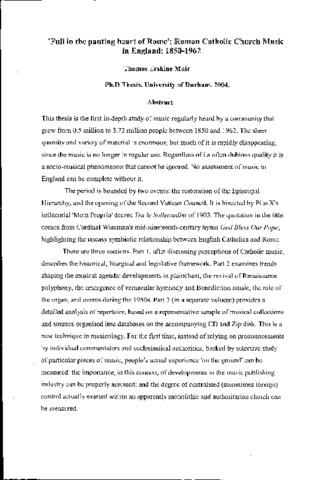 This thesis is the first in-depth study o f music regularly heard by a community that grew from 0.5 million to 3.72 million people between 1850 and 1962. The sheer quantity and variety o f material is enormous; but much o f it is rapidly disappearing, since the music is no longer in regular use. Regardless o f its often dubious quality it is a socio-musical phenomenon that cannot be ignored. No assessment of music in England can be complete without it. The period is bounded by two events: the restoration o f the Episcopal Hierarchy, and the opening o f the Second Vatican Council. It is bisected by Pius X's influential 'Motu Proprio' decree Tra le Sollectudini of 1903. The quotation in the titlecomes from Cardinal Wiseman's mid-nineteenth-century hymn God Bless Our Pope; highlighting the uneasy symbiotic relationship between English Catholics and Rome. There are three sections. Part 1, after discussing perceptions o f Catholic music, describes the historical, hturgical and legislative framework. Part 2 examines trends shaping the musical agenda: developments in plainchant, the revival of Renaissance polyphony, the emergence o f vernacular hymnody and Benediction music, the role o f the organ, and events during the 1950s. Part 3 (in a separate volume) provides a detailed analysis of repertoire, based on a representative sample of musical collections and sources organised into databases on the accompanying CD and Zip disk. This is a new technique in musicology. For the first time, instead of relying on pronouncements by individual commentators and ecclesiastical authorities, backed by selective study of particular pieces o f music, people's actual experience 'on the ground' can be measured; the importance, in this context, o f developments in the music publishing industry can be properly assessed; and the degree o f centralised (sometimes foreign) control actually exerted within an apparently monolithic and authoritarian church can be measured.
