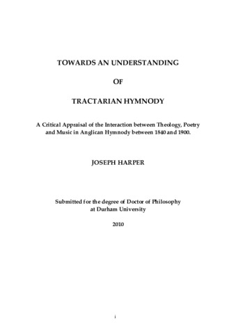 TOWARDS AN UNDERSTANDING OF TRACTARIAN HYMNODY: A Critical Appraisal of the Interaction between Theology, Poetry and Music in Anglican Hymnody between 1840 and 1900.
