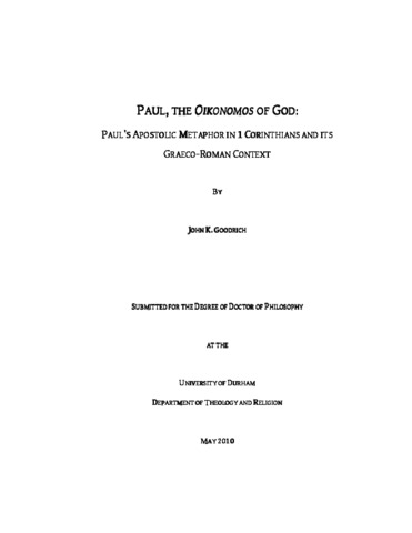 This thesis seeks to elucidate the nature of Paul’s apostleship and apostolic authority by investigating how Paul portrays himself as an oikonomos of God in 1 Corinthians (4.1-5; 9.16-23). Modern studies on the metaphor have failed to ascertain what apostolic attributes are implied by the image and how Paul utilised the metaphor to meet his rhetorical and theological objectives, largely because they neither identify the appropriate source domain of Paul’s metaphor nor conduct the necessary socio-historical research to illumine its application. Utilising a host of ancient sources to reconstruct the characteristics of the regal, municipal, and private administrators bearing this title, this study seeks to identify the metaphor’s source domain and to interpret the relevant Pauline discourses accordingly. Part 1 surveys the three administrative contexts from Graeco-Roman antiquity in which oikonomoi are most frequently attested: Hellenistic kingdoms (Chapter 2), Graeco-Roman cities (Chapter 3), and private estates and enterprises (Chapter 4). While minor variations existed within these administrative contexts, a general profile is discernable in and constructed for each. Moreover, although the profiles of the oikonomoi serving in these contexts share certain similar social, structural, and disciplinary characteristics, these administrators are also shown to have significant differences. Part 2 engages 1 Corinthians 4 and 9 seeking to identify and interpret Paul’s metaphor in both discourses. Chapter 5 demonstrates that, of the three source domains examined in Part 1, private commercial administration functions as the most plausible context in which to interpret Paul’s metaphor. Chapters 6 and 7 then utilise the profile of the private commercial administrator as a model to illumine Paul’s apostleship in 1 Cor 4.1-5 and 9.16-23 respectively and explains how Paul employs the image to meet his rhetorical and theological objectives in both passages. Chapter 8 summarises the argument of the thesis and draws out the implications of Paul’s metaphor for understanding Paul’s theology of apostolic authority.