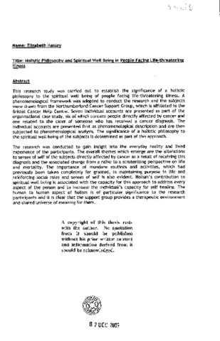 Holistic philosophy and spiritual well being in people facing life-threatening illness