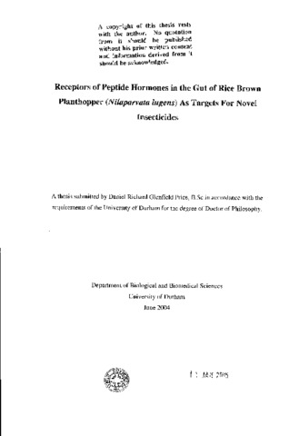 The rice brown planthopper, Nilaparvata lugens, is a pest of rice where it can be responsible for single season crop losses of up to 38% (IRRI statistic). Due to the absence of an effective Bacillus thuringiensis (Bt) toxin against these insect pests current control methods are reliant on synthetic insecticides. However, these broad acting insecticides can be harmful to beneficial insects, and resistance to these synthetic insecticides amongst N.lugens populations is now common. Therefore, other novel approaches are needed for the control of this rice pest species, which is addressed in this thesis. This project aims to characterise proteins expressed in the N.lugens gut that could act as potential 'targets' for the design of insecticidal proteins. G protein coupled receptor (GPCR) proteins were identified as 'target' proteins and N.lugens candidates were identified and characterised. A cDNA predicted to encode a diuretic hormone receptor (DHR) in Nilaparvata lugens was cloned using RNA extracted from gut tissue as a template in a PCR based strategy. The coding sequence (639 amino acids, 69.7 kDa) has seven predicted transmembrane domains and is a member of the calcitonin/secretin/corticotropin releasing factor family of G-protein coupled receptors. The protein has greatest similarity to Acheta domesticus DHR (Q16983) with 51% sequence identity. N.lugens DHR has a large N-terminal extracellular domain (amino acids 1-260) putatively involved in hormone binding. This domain was expressed as a recombinant protein in E.coli, purified under denaturing conditions, refolded and used to raise a polyclonal antibody in rabbit. Purified anti-DHR IgG bound specifically to a putative DHR polypeptide extracted from N.lugens gut tissues on western blots. Immunolocalisation experiments using dissected guts showed that anti-DHR antibody bound specifically to the Malpighian tubules. The N- terminal hormone-binding domain is located on the cell surface and is exposed to the haemolymph in vivo. Anti-DHR antibodies delivered to insects via artificial diet showed no binding to gut or tubule tissue, and had no effect on survival. Ingested antibodies were not detected in the haemolymph. Another GPCR protein with high similarity to insect allatostatin receptors (ALSTR) was isolated by PCR using highly degenerate primers, from N.lugens gut specific cDNA. The coding sequence (383 amino acids, M, 42.3 kDa) has seven predicted transmembrane domains and is a member of the SST/galanin/opoid receptor family of G-protein coupled receptors. The putative N.lugens ALSTR has greatest similarity to Periplaneta americana ALSTR (AF336364) with 69% overall sequence identity. Isolation of the full-length N.lugens ALSTR is the first step necessary for the design of novel insecticidal proteins.
