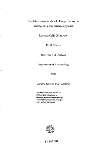 This thesis concerns the movement of hominid groups into Europe during the Pleistocene. Four key issues are addressed by this project: the determination of whether it is possible to detect periods of movement in the archaeological record; the examination of whether archaeological treatments of movement have been justified; the establishment of a framework of interpretation of the archaeological record of movement in order to allow movement processes to be investigated; and the exploration of possible changes in the nature of population movements during the Pleistocene. In order to fulfill these aims, and to overcome the lack of a comparative ethnographic record of hunter-gatherer population expansion, a review of population movement processes described by academic disciplines that observe dispersals and migrations of human groups and non-human species, such as ecology, sociology and geography is presented. The processes highlighted by this review are used to build an interpretive framework of the behaviours associated with movement. The current state of archaeological knowledge of movement processes is discussed, in the form of a narrative analysis of the work of four archaeologists that have extensively worked on hominid dispersals. A methodology for the study of population movement processes in the Pleistocene is forwarded, and applied to the initial occupation of Europe during the Early and Middle Pleistocene, and the spread of Homo sapiens groups and the Upper Palaeolithic during the Late Pleistocene. The strength of the interpretive framework, and the usefulness of the concepts taken from contemporary observations of movements are considered, and the value of the archaeological approaches to the episodes of movement is evaluated. The interpretive framework is also used to assess whether social or biological models are more applicable to Pleistocene hominid movements. Recommendations for future studies of past population movements through the archaeological record conclude the thesis.