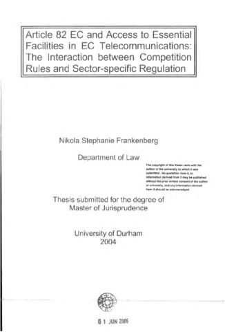 The liberalization of the EC telecommunications market has, from the beginning, been based on a dual-regime of sector-specific regulation and competition law. One of the areas where the interrelation between these two sets of rules is most obvious is that of access to telecommunications networks. The material in this thesis is up to date as of the 31st July, 2004. This thesis examines the Essential Facilities Doctrine (EFD) as the competition law principle which deals with access of new market entrants to established facilities and, in the case of telecommunications, networks. This examination leads to the conclusion that if there is an EFD in EC law, it should be applied with extreme caution. The thesis then examines the New Regulatory Framework for Electronic Communications, with a particular emphasis on the framework for access and interconnection, and concludes that EC competition law has acquired a prevailing role in the context of regulation of telecommunications. The reform of regulation of electronic communications that is so profoundly inspired by competition law principles, marks a previously unattained level of mutual interaction between regulation and EC antitrust law. Concerning the viability of this dual regime of competition law and regulation, the thesis comes to the conclusion that before sustainable competition has been established, a certain degree of sector-specific regulation has to be upheld. Phasing-out sector-specific regulation too early by relying solely on competition law would create considerable risks for both new entrants and incumbent operators.