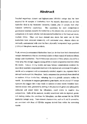 Detailed major/trace element and high-precision Hf-Nd-Sr isotope data has been acquired for 86 samples of kimberlites from the recently discovered Lac de Gras kimberlite field in the Northwest Territories, Canada, plus 23 samples from other Canadian kimberlite occurrences. This constitutes the most comprehensive geochemical database available for kimberlites at the present time, and allows detailed comparisons to be made with the well-documented kimberlites of the Kaapvaal craton, southern Africa. Major and trace element data shows that some Lac de Gras kimberlites have interacted extensively with continental crust, whereas others are minimally contaminated with crust but have physically incorporated large quantities (˃30%) of lithospheric mantle peridotite. Fresh, minimally-contaminated kimberlites from Lac de Gras have both elemental and isotopic characteristics that are transitional relative to those typical of southern African Group I and II kimberlites. The Hf-Nd isotope variations of these samples also define a linear array that strongly suggests mixing of two or more components/reservoirs within the mantle. Isotopic mixing models and mass balance considerations constrain the most likely candidate components/reservoirs to be depleted sub-continental lithospheric mantle and a component with an isotopically-enriched, negative ΔɛHf signature that is derived from beneath the lithosphere. Such a component has previously been identified in southern African kimberlites, indicating that it is globally extensive within the mantle. Its resfriction to magmas generated at great depths, and its unusual Hf isotope signature also suggest that it may reside in isolation at some mantle boundary layer. Ancient oceanic crust, generated by melting in the presence of garnet and subsequently subducted and stored below the lithosphere, could evolve to negative ΔɛHf compositions. Melts of this material, variably recombined with the depleted, garnet- rich melting residua that constitute the lithosphere, can then account for the Hf-Nd kimberiite isotopic array. Trace element characteristics, such as K and Sr anomalies, are consistent with those of OIB-like magmas derived from within the convecting mantle.