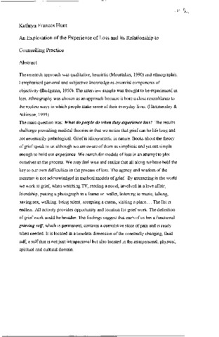 The research approach was qualitative, heuristic (Moustakas, 1990) and ethnographic. I emphasised personal and subjective knowledge as essential components of objectivity (Bridgman, 1950). The interview sample was thought to be experienced in loss. Ethnography was chosen as an approach because it bore a close resemblance to the routine ways in which people make sense of their everyday lives. (Hammersley & Atkinson, 1995)The main question was: What do people do when they experience loss? The results challenge prevailing medical theories in that we notice that grief can be life long and not necessarily pathological. Grief is idiosyncratic in nature. Books about the theory of grief speak to us although we are aware of them as simplistic and yet not simple enough to hold our experience. We search for models of loss in an attempt to plot ourselves in the process. We may feel wise and realise that all along we have held the key to our own difficulties in the process of loss. The agency and wisdom of the mourner is not acknowledged in medical models of grief. By interacting in the world we work at grief, when watching TV, reading a novel, involved in a love affair, friendship, putting a photograph in a frame or wallet, listening to music, talking, having sex, walking, being silent, accepting a caress, visiting a place.... The list is endless. All activity provides opportunity and location for grief work. The definition of grief work could be broader. The findings suggest that each of us has a functional grieving self, which is permanent, contains a cumulative store of pain and is ready when needed. It is located in a timeless dimension of the constantly changing, fluid self, a self that is not just intrapersonal but also located in the interpersonal, physical, spiritual and cultural domain.