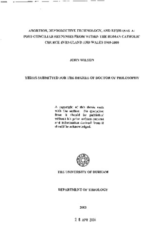 This thesis is the product of original research into the responses offered by the Roman Catholic Church in England and Wales to the subjects of abortion, reproductive technology, and euthanasia, during the years 1965 to 2000. While focused on the period following the Second Vatican Council (1962-1965), it also offers an introductory historical overview of the Catholic moral tradition, and, more precisely, it assesses relevant pre-Conciliar responses from within the English and Welsh Catholic Church. The main substance of the thesis concentrates on post-Conciliar treatment of abortion, reproductive technology, and euthanasia, providing detailed and comprehensive exposition of the themes under review, and reflective analysis of their significance. Through an extensive location and examination of primary and secondary sources, this investigation makes an original contribution to the understanding of the bioethical attitude and approach of the Roman Catholic Church in England and Wales. In this, it is necessarily contextualised within a wider appreciation of social, moral, and ecclesiological questions. The thesis, together with its inclusive bibliography, provides a useful point of reference for any further and future research in this area.
