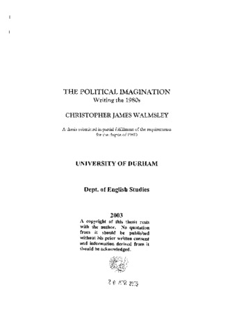 The connection between imaginative writing and the political has always been contentious, and whilst many critics see literature as the creation of contemporary mythologies by which we negotiate our lived experience there are others who refute such a politicisation in favour of the singular aesthetic experience. This thesis will argue that the literary and the political are immutably bound in an undeniable relationship: a relationship which encompasses the construction of sexual, cultural and racial identities, questions of censorship and the concept of freedom and the mutual dependence of the individual subject and society. Like most epochs, the 1980s both invites and repels a tendency to organise its events into a single, understandable and easily internalised diachronic order, an order that will mask or efface the complex contradictions and multiplicity of possibilities that emerge. Through a series of close readings of arbitrarily selected literary and popular fictions, the thesis conducts an examination of the tensions, issues, conflicts and theoretical perspectives of this divisive decade. This project, however, is not just an attempt to chronicle a vast and fertile period of literature. It seeks to define the political imagination, to counteract the Bloomian claims that literature is a private space of imaginative production and passive aesthetic reflection, insisting that the political imagination is an inexorable part of social and cultural life which can neither be denied nor appropriated by a singular agenda or master code.