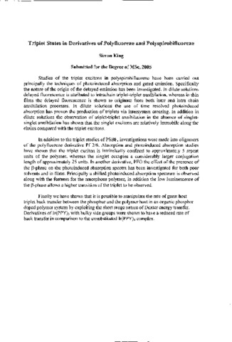 Studies of the triplet excitons in polyspirobifluorene have been carried out principally the techniques of photo induced absorption and gated emission. Specifically the nature of the origin of the delayed emission has been investigated. In dilute solutions delayed fluorescence is attributed to intrachain triplet-triplet annihilation, whereas in thin films the delayed fluorescence is shown to originate from both inter and intra chain annihilation processes. In dilute solutions the use of time resolved photo induced absorption has proven the production of triplets via intersystem crossing. In addition in dilute solutions the observation of triplet-triplet annihilation in the absence of singlet-singlet annihilation has shown that the singlet excitons are relatively immobile along the chains compared with the triplet excitons. In addition to the triplet studies of PSBF, investigations were made into oligomers of the polyfluorene derivative Pf 2/6. Absorption and photo induced absorption studies have shown that the triplet exciton is intrinsically confined to approximately 5 repeat units of the polymer, whereas the singlet occupies a considerably larger conjugation length of approximately 25 units. In another derivative, PFO the effect of the presence of the P-phase on the photo induced absorption spectra has been investigated for both poor solvents and in films. Principally a shifted photoinduced absorption spectrum is observed along with the features for the amorphous polymer, in addition the low luminescence of the P-phase allows a higher transition of the triplet to be observed. Finally we have shown that it is possible to manipulate the rate of guest host triplet back transfer between the phosphor and the polymer host in an organic phosphor doped polymer system by exploiting the short range nature of Dexter energy transfer. Derivatives of Ir(PPY)3 with bulky side groups were shown to have a reduced rate of back transfer in comparison to the unsubstituted Ir(PPY)3 complex.