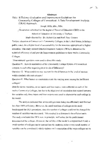 Tertiary education at Connecticut's Community Colleges, in the United States, is facing a public outcry for a higher level of accountability for the resources appropriated to higher education. This study utilized Data Envelopment Analysis (DEA) to determine the technical efficiency of and provide Improvement guidelines to these twelve Community Colleges. Three research questions were used to direct this study: Question #1: How do institutions of the Community College System of Connecticut compare to each other regarding their levels of Efficiency? Question #2: What conditions may account for the differences in the level of success within similarly efficient colleges? Question #3: What factors or constraints create the varying score among the inefficient colleges? Data for eleven variables, seven inputs and four output, were collected on each of the twelve Community Colleges, but due to the high level of correlation that existed between the variables only three inputs and four outputs were used to characterize each college in the model. The analysis indicated that seven colleges were being run efficiently and five had less than 100% efficiency. However, the small numbers of colleges in the study handicapped the DEA procedure, since the number of colleges could not be changed the number of variables was decreased. This resulted in a decrease in the efficient units. The study concluded that DEA was, in principle, well suited for the performance assessment of the colleges. However, the validity of the model is compromised if only a small number of colleges can be entered into the analysis; either a very small number of variables can be considered ( which violates one's conception of the ways colleges are to be judged, and the number of independent variables that can be considered), or the requirements of the model are violated ( which necessarily produces the result that a large number of colleges are spuriously designated as 100 % efficient)