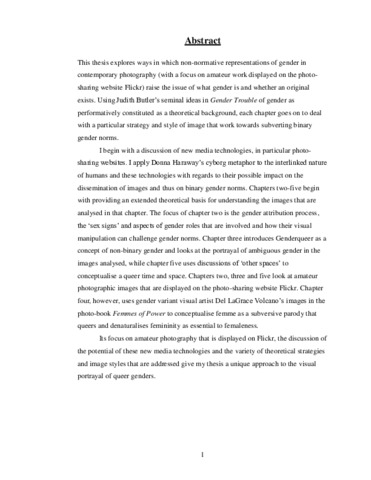 Abstract This thesis explores ways in which non-normative representations of gender in contemporary photography (with a focus on amateur work displayed on the photo-sharing website Flickr) raise the issue of what gender is and whether an original exists. Using Judith Butler‟s seminal ideas in Gender Trouble of gender as performatively constituted as a theoretical background, each chapter goes on to deal with a particular strategy and style of image that work towards subverting binary gender norms. I begin with a discussion of new media technologies, in particular photo-sharing websites. I apply Donna Haraway‟s cyborg metaphor to the interlinked nature of humans and these technologies with regards to their possible impact on the dissemination of images and thus on binary gender norms. Chapters two-five begin with providing an extended theoretical basis for understanding the images that are analysed in that chapter. The focus of chapter two is the gender attribution process, the „sex signs‟ and aspects of gender roles that are involved and how their visual manipulation can challenge gender norms. Chapter three introduces Genderqueer as a concept of non-binary gender and looks at the portrayal of ambiguous gender in the images analysed, while chapter five uses discussions of „other spaces‟ to conceptualise a queer time and space. Chapters two, three and five look at amateur photographic images that are displayed on the photo-sharing website Flickr. Chapter four, however, uses gender variant visual artist Del LaGrace Volcano‟s images in the photo-book Femmes of Power to conceptualise femme as a subversive parody that queers and denaturalises femininity as essential to femaleness. Its focus on amateur photography that is displayed on Flickr, the discussion of the potential of these new media technologies and the variety of theoretical strategies and image styles that are addressed give my thesis a unique approach to the visual portrayal of queer genders.