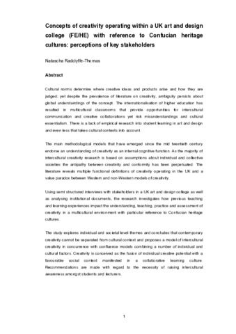 Cultural norms determine where creative ideas and products arise and how they are judged; yet despite the prevalence of literature on creativity, ambiguity persists about global understandings of the concept. The internationalisation of higher education has resulted in multicultural classrooms that provide opportunities for intercultural communication and creative collaborations yet risk misunderstandings and cultural essentialism. There is a lack of empirical research into student learning in art and design and even less that takes cultural contexts into account. The main methodological models that have emerged since the mid twentieth century endorse an understanding of creativity as an internal cognitive function. As the majority of intercultural creativity research is based on assumptions about individual and collective societies the antipathy between creativity and conformity has been perpetuated. The literature reveals multiple functional definitions of creativity operating in the UK and a value paradox between Western and non-Western models of creativity. Using semi structured interviews with stakeholders in a UK art and design college as well as analysing institutional documents, the research investigates how previous teaching and learning experiences impact the understanding, teaching, practice and assessment of creativity in a multicultural environment with particular reference to Confucian heritage cultures. The study explores individual and societal level themes and concludes that contemporary creativity cannot be separated from cultural context and proposes a model of intercultural creativity in concurrence with confluence models combining a number of individual and cultural factors. Creativity is conceived as the fusion of individual creative potential with a favourable social context manifested in a collaborative learning culture. Recommendations are made with regard to the necessity of raising intercultural awareness amongst students and lecturers.
