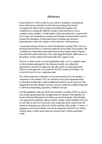 Based on Mayer’s (2001) model for more effective learning by exploiting the brain’s dual sensory channels for information processing, this research investigates the effectiveness of using aural instructions together with visualisation in teaching the difficult concepts of data structures to novice computer science students. A small number of previous studies have examined the use of audio and visualisation in teaching and learning environments but none has explored the integration of both technologies in teaching data structures programming to reduce the cognitive load on learners’ working memory. A prototype learning tool, known as the Data Structure Learning (DSL) tool, was developed and used first in a short mini study that showed that, used together with visualisations of algorithms, aural instructions produced faster student response times than did textual instructions. This result suggested that the additional use of the auditory sensory channel did indeed reduce the cognitive load. The tool was then used in a second, longitudinal, study over two academic terms in which students studying the Data Structures module were offered the opportunity to use the DSL approach with either aural or textual instructions. Their use of the approach was recorded by the DSL system and feedback was invited at the end of every visualisation task. The collected data showed that the tool was used extensively by the students. A comparison of the students’ DSL use with their end-of-year assessment marks revealed that academically weaker students had tended to use the tool most. This suggests that less able students are keen to use any useful and available instrument to aid their understanding, especially of difficult concepts. Both the quantitative data provided by the automatic recording of DSL use and an end-of-study questionnaire showed appreciation by students of the help the tool had provided and enthusiasm for its future use and development. These findings were supported by qualitative data provided by student written feedback at the end of each task, by interviews at the end of the experiment and by interest from the lecturer in integrating use of the tool with the teaching of the module. A variety of suggestions are made for further work and development of the DSL tool. Further research using a control group and/or pre and post tests would be particularly useful.