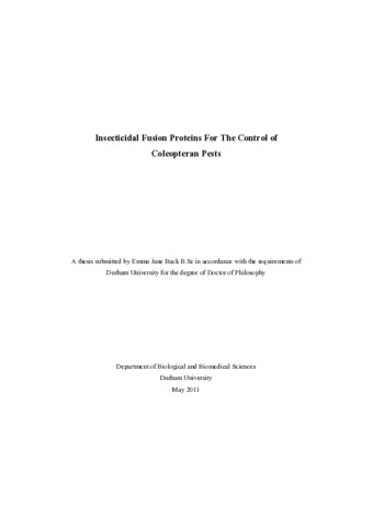 Fusion proteins containing a toxin fused to a carrier domain which directs transport across the insect gut epithelium have been shown to be effective orally active insecticides. Expression of functional recombinant fusion proteins comprising of snowdrop lectin (Galanthus nivalis agglutinin; GNA) fused to toxins from Indian red scorpion (Mesobuthus tamulus toxin; ButaIT) and Blue Mountains funnel-web spider (Hadronyche versuta toxins; ω-ACTX-Hv1a (ω-ACTX); κ-ACTX-Hv1c (κ-ACTX)) was carried out in both yeast (Pichia pastoris) and plant (Arabidopsis thaliana) expression systems. Addition of purification tags, altering the design of assembly of the fusion protein and point mutation of toxin sequence were all investigated to improve yield and reduce proteolytic cleavage during expression and purification. Recombinant proteins were assayed for oral toxicity against T. castaneum as a model coleopteran species. Fusion proteins incorporating ButaIT and ω-ACTX toxins showed toxicity ranging from complete mortality when fed at 1mg g-1 ((his)6-GNA-ω-ACTX and ω-ACTX-GNA-(his)6) to 65% mortality when fed at 2mg g-1 (ButaIT-GNA-(his)6). Fusion proteins incorporating κ-ACTX and GNA were shown to be non-toxic despite individual components being functional. Lack of toxicity was due to high proteolytic cleavage in the insect gut environment. Data was obtained to support the use of Tribolium as a model for wireworm (Agriotes spp.), serious pests of potatoes in the UK. Selected fusion proteins were expressed in transgenic Arabidopsis. Expression for ButaIT-GNA as a fusion polypeptide was readily detectable in transformants with estimated levels of expression of approx. 0.15% total soluble protein in leaf tissue. When plants expressing ButaIT-GNA fusion protein were fed to larvae of the tomato moth (Lacanobia oleracea) the fusion protein was shown to be fully functional with levels of toxicity comparable to that seen in previous artificial diet bioassays. ω-ACTX based constructs expressed in Arabidopsis were subject to high levels of proteolytic cleavage in planta and so were not assayed for toxicity.