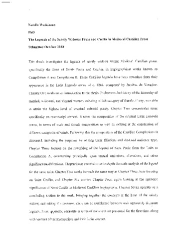 This thesis investigates the legends of saintly widows within Medieval Castilian prose, specifically the lives of Saints Paula and Cecilia, in hagiographical works known as Compilation A and Compilation B. These Castilian legends have been reworked from their appearance in the Latin Legenda aurea of c. 1264, composed by Jacobus de Voragine. Chapter One works as an introduction to the thesis. It observes the history of the hierarchy of married, widowed, and virginal women, debating which category of female, if any, was able to attain the highest level of eventual celestial purity. Chapter Two concentrates more specifically on manuscript context. It notes the composition of the original Latin Legenda aurea, in terms of male and female composition as well as looking at the constitution of different categories of saints. Following this the composition of the Castilian Compilations is discussed, including the purposes for writing these filiations and destined audience type. Chapter Three focuses on the reworking of the legend of Saint Paula from the Latin to Compilation A, commenting principally upon textual omissions, alterations, and other significant modifications. Chapter Four undertakes an in-depth thematic analysis of the legend for the same saint. Chapter Five works in much the same way as Chapter Three, here focusing on Saint Cecilia, and Chapter Six mirrors Chapter Four, again looking at the symbolic significance of Saint Cecilia in Medieval Castilian hagiography. Chapter Seven operates as a concluding section to the work, bringing together the concepts at the heart of the saintly widow, and asking if a common ethos can be established between such apparently disparate legends. In an appendix, complete editions of each text are presented for the first time, along with xeroxes of the manuscripts and their Latin sources.
