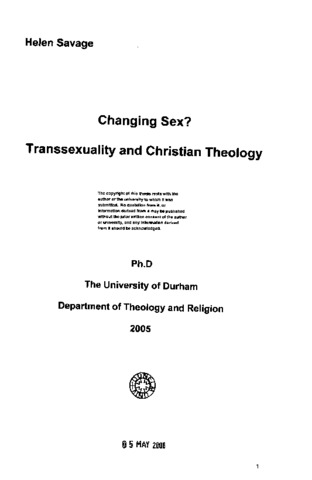 This thesis ia an interdiscipinary study about the nature and causes of transsexuality and an attempt to formulate a Christian ethical response to it, a subject which until now has received no extended academic attention from a Christian perspective. There are two aims. The first is to examine what the Christian theological tradition has to say about transsexuality. the second is to explore what the experience of transsexual people has to say to the Church, and to the formation of its theology and ethics. It is a survey of the evidence for the existence of transsexuality prior to the twentieth century, when it was first recognised and described. It explores the experience of transsexual and some transgendered people in Britain today. It pays particular attention to their encounters with and within the Church. It investigates how those transsexual and transgendered people who profess Christian faith use the Bible and relate to the Christian tradition as they attempt to understand their condition better, and try to come to terms with the theological issues that this process of reflection raises - an example of 'ordinary theology'.It then examines what the Bible and the Christian tradition themselves might have to say about transsexuality, and about those same far-reaching issues, which include the significance of the human self, of embodiment and of sex, gender and sexuality. It draws in particular on the foundational theology of Irenaeus, Tertullian, Origen and Gregory of Nyssa and on the writings of four contemporary theologians: Lisa Sowle Cahill, Elaine Graham, Susan Frank Parsons and Rowan Williams. At the heart of the study are seven detailed case studies of transsexual or transgendered British Christians, but I also draw on a personal engagement with around twenty five others over a period of almost thirty months.