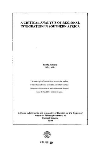 The collapse of state communism in Eastern Europe during the second half of the past decade and the subsequent demise of autocratic regimes in Africa presented the people of Southern Africa with new challenges that have become increasingly entangled in issues relating to democracy, freedom and choice. In Southern Africa, poor economic performance by individual countries coupled with the destabilisation policies pursued by a dominant apartheid regime in South Africa encouraged black independent states in the region to establish mechanisms through which their dependence on South Africa could be reduced. These efforts took the form of setting up the Southern African Development Coordination Conference (SADCC) and consolidating the Preferential Trade Area (PTA). But, how successful have these attempts been in acheiving their goals? If not, are there any alternatives that can be explored in future? Will the political changes currently in the making in South Africa have a significant effect on Regional Integration in Southern Africa? Answers to these questions are not easy to find. Nevertheless, there is s growing realisation among academics and politicians in the region that unless these questions are faced head-on, it could be a long time indeed before the region begins to benefit from the New International Political and Economic arrangements that the end of the Cold War have given rise to. It is in this context that I undertook the present study, the primary aim of which was to critically examine regional integration in Southern Africa with the goal of unravelling the historical and contemporary realities that make economic and political integration in Southern Africa a lucrative 'pillar' for current development programmes in the region. It is argued that in spite of their ambitious goals, the governments of Southern Africa will have to address their regional problems more realistically before they can succeed in putting in place a viable mechanism for regional integration. There is evidence that this realism is beginning to seed,giving some a new-found optimism that could steer the region into more fruitful debate and pragmatism.