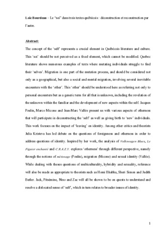 The concept of the ‘self’ represents a crucial element in Québécois literature and culture. This ‘soi’ should be not perceived as a fixed element, which cannot be modified. Quebec literature shows numerous examples of texts where mutating individuals struggle to find their ‘selves’. Migration is one part of the mutation process, and should be considered not only as a geographical, but also a social and mental migration, involving several inevitable encounters with the ‘other’. This ‘other’ should be understood here as referring not only to personal encounters but as a generic term for all that is unknown, including the revelation of the unknown within the familiar and the development of new aspects within the self. Jacques Poulin, Marco Micone and Jean-Marc Vallée present us with various aspects of otherness that will participate in deconstructing the ‘self’ as well as giving birth to ‘new’ individuals. This work focuses on the impact of ‘leaving’ on identity. Among other critics and theorists Julia Kristeva has led debate on the questions of foreignness and otherness in order to address questions of identity. Inspired by her work, the analysis of Volkswagen Blues, Le Figuier enchanté and C.R.A.Z.Y. explores ‘otherness’ through different perspective, namely through the notions of métissage (Poulin), migration (Micone) and sexual identity (Vallée). While dealing with theses questions of multiculturality, hybridity and sexuality, reference will also be made as appropriate to theorists such as Homi Bhabha, Sheri Simon and Judith Butler. Jack, Pitsémine, Nino and Zac will all be shown to be on quests to understand and resolve a dislocated sense of ‘self’, which in turn relates to broader issues of identity.