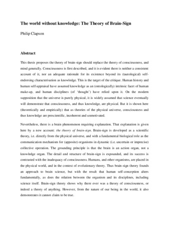 This thesis proposes the theory of brain-sign should replace the theory of consciousness, and mind generally. Consciousness is first described, and it is evident there is neither a consistent account of it, nor an adequate rationale for its existence beyond its (tautological) self-endorsing characterisation as knowledge. This is the target of the critique. Human history and human self-appraisal have assumed knowledge as an (ontologically) intrinsic facet of human make-up, and human disciplines (of ‘thought’) have relied upon it. On the modern supposition that the universe is purely physical, it is widely assumed that science eventually will demonstrate that consciousness, and thus knowledge, are physical. But it is shown here (theoretically and empirically) that as theories of the physical universe, consciousness and thus knowledge are prescientific, incoherent and unmotivated. Nevertheless, there is a brain phenomenon requiring explanation. That explanation is given here by a new account: the theory of brain-sign. Brain-sign is developed as a scientific theory, i.e. directly from the physical universe, and with a fundamental biological role as the communication mechanism for (apposite) organisms in dynamic (i.e. uncertain or imprecise) collective operation. The grounding principle is that the brain is an action organ, not a knowledge organ. The detail and structure of brain-sign is expounded, and its success is contrasted with the inadequacy of consciousness. Humans, and other organisms, are placed in the physical world, and in the context of evolutionary theory. Thus brain-sign theory founds an approach to brain science, but with the result that human self-conception alters fundamentally, as does the relation between the organism and its disciplines, including science itself. Brain-sign theory shows why there ever was a theory of consciousness, or indeed a theory of anything. However, from the nature of our being in the world, it also demonstrates it cannot claim to be true.
