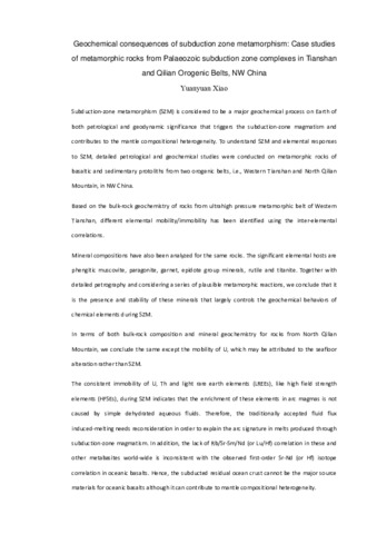 Subduction-zone metamorphism (SZM) is considered to be a major geochemical process on Earth of both petrological and geodynamic significance that triggers the subduction-zone magmatism and contributes to the mantle compositional heterogeneity. To understand SZM and elemental responses to SZM, detailed petrological and geochemical studies were conducted on metamorphic rocks of basaltic and sedimentary protoliths from two orogenic belts, i.e., Western Tianshan and North Qilian Mountain, in NW China. Based on the bulk-rock geochemistry of rocks from ultrahigh pressure metamorphic belt of Western Tianshan, different elemental mobility/immobility has been identified using the inter-elemental correlations. Mineral compositions have also been analyzed for the same rocks. The significant elemental hosts are phengitic muscovite, paragonite, garnet, epidote group minerals, rutile and titanite. Together with detailed petrography and considering a series of plausible metamorphic reactions, we conclude that it is the presence and stability of these minerals that largely controls the geochemical behaviors of chemical elements during SZM. In terms of both bulk-rock composition and mineral geochemistry for rocks from North Qilian Mountain, we conclude the same except the mobility of U, which may be attributed to the seafloor alteration rather than SZM. The consistent immobility of U, Th and light rare earth elements (LREEs), like high field strength elements (HFSEs), during SZM indicates that the enrichment of these elements in arc magmas is not caused by simple dehydrated aqueous fluids. Therefore, the traditionally accepted fluid flux induced-melting needs reconsideration in order to explain the arc signature in melts produced through subduction-zone magmatism. In addition, the lack of Rb/Sr-Sm/Nd (or Lu/Hf) correlation in these and other metabasites world-wide is inconsistent with the observed first-order Sr-Nd (or Hf) isotope correlation in oceanic basalts. Hence, the subducted residual ocean crust cannot be the major source materials for oceanic basalts although it can contribute to mantle compositional heterogeneity.
