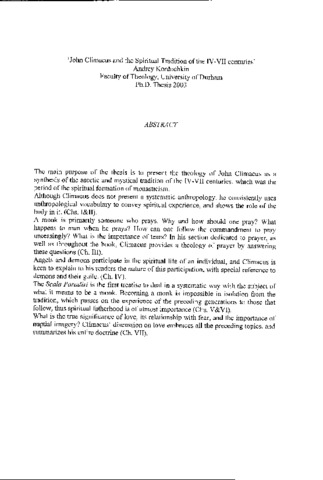 The main purpose of the thesis is to present the theology of John Climacus as a synthesis of the ascetic and mystical tradition of the IV-VII centuries, which was the period of the spiritual formation of monasticism. Although Climacus does not present a systematic anthropology, he consistently uses anthropological vocabulary to convey spiritual experience, and shows the role of the body in it. (Chs. I&II). A monk is primarily someone who prays. Why and how should one pray? What happens to man when he prays? How can one follow the commandment to pray unceasingly? What is the importance of tears? In his section dedicated to prayer, as well as throughout the book, Climacus provides a theology of prayer by answering these questions (Ch. III).Angels and demons participate in the spiritual life of an individual, and Climacus is keen to explain to his readers the nature of this participation, with special reference to demons and their guile. (Ch. IV).The Scala Paradisi is the first treatise to deal in a systematic way with the subject of what it means to be a monk. Becoming a monk is impossible in isolation from the tradition, which passes on the experience of the preceding generations to those that follow, thus spiritual fatherhood is of utmost importance (Chs. V&VI). What is the true significance of love, its relationship with fear, and the importance of nuptial imagery? Climacus' discussion on love embraces all the preceding topics, and summarizes his entire doctrine (Ch. VII).