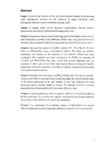 Chapter 1 reviews the literature on the use of solvothermal methods for synthesising metal chalcogenide materials and the structures of copper containing metal chalcogenide materials based on tetrahedral bonding motifs. Chapter 2 contains details of the structural characterisation, physical property measurements and synthetic methods used throughout this work. Chapter 3 summarises work on ways of modelling preferred orientation and anisotropic peak broadening in powder X-ray diffraction (PXRD) data using spherical harmonic functions; these are applied to data from compounds discussed elsewhere in this thesis. Chapter 4 discusses the synthesis of Cu(_2)MX(_4) materials (M = W or Mo; X = S, Se or S/Se) and PPh(_4)CuWSe(_4) using a solvothermal method. The effects of synthesis temperature and pressure on the structures of the materials formed have been investigated. The materials have been characterised by PXRD, the structures of ICu(_2)WS(_4) and PPh(_4)CuWSe(_4) have been solved from powder diffraction data; the structures of other materials have been determined by Rietveld refinement. Variable temperature diffraction experiments and physical property measurements have been performed on selected materials. Chapter 5 describes structural studies on (PPh(_4))(_2)M(WS(_4)(_2))(M = Co, Ni, Zn) materials. Single crystal diffraction has been used to further investigate the complex superstructure of the known polymorph of the zinc material. A new zinc polymorph has been discovered and its structure studied by PXRD. The structure of the Ni containing material has been determined directly from powder diffraction data. Chapter 6 outlines preliminary work on materials which are tentatively described as M(_x)WS(^2) intercalates. X-ray diffraction, magnetic measurements and Energy Dispersive-ray Analysis have all been used to probe their properties. Chapter 7 is a discussion of the structure solution of (NH(_4))2WS(_3)O from powder diffraction data and a variable temperature diffraction experiment on the same material.