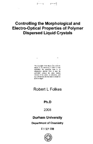 Polymer dispersed liquid crystals have shown potential as the basis for a new display screen technology which can be used to produce flexible displays. The work presented here investigates the properties during the synthesis process of PDLCs, which affect the electro-optical properties of the films produced. An investigation is performed through the use of small angle light scattering, and small angle neutron scattering, into the thermodynamic phase properties of the initial liquid crystal monomer solution from which the PDLCs are formed. Through the use of small angle light scattering and ESEM the phase separation mechanism is determined and the morphological properties of films formed under different thermodynamic conditions are investigated and linked to the electro-optical properties of test films. It is shown that due to the rod like nature of liquid crystal molecules that the monomer/liquid crystal phase properties cannot be explained by classic polymer solution thermodynamics. Phase separation is shown to occur by one of two mechanisms depending upon whether or not a crosslinking monomer species is present, either a gel phase separation mechanism or a viscoelastic mechanism. Depending upon the initial thermodynamic properties of the system the formation of a polymer network can either act to promote (resulting in a large droplet morphology size) or suppress (resulting in small impure liquid crystal droplets) phase separation. This in turn is linked to the effectiveness of films formed under given conditions as potential display devices. With thanks to EPSRC and Sony MSL, Stuttgart for funding
