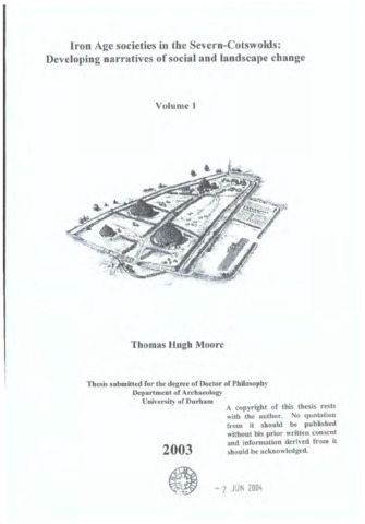 The Severn-Cotswold region occupies a pivotal position in Iron Age studies, lying at the interface between the well-studied regions of Wessex, the Upper Thames Valley and the Welsh Marches. In contrast to them, the Severn-Cotswolds has continued to be neglected despite the rich potential demonstrated by earlier surveys and excavations. This study sets the Iron Age of the Severn-Cotswold region in a national context. Both the older material and the mounting new evidence from rescue excavations are examined and interpreted in the light of recent theoretical advances. Aerial photographs have been used to enhance understanding of unexcavated sites which, alongside a database of excavated sites, provide a morphological framework to assess variation in settlement form and social organisation. The material culture and exchange networks of the later 1(^st) millennium BC are also assessed within a wider social context stressing the need to incorporate production, exchange and deposition when studying Iron Age societies. This material is used to construct a narrative of social and landscape change identifying the complexity of community reactions to wider cultural developments. It is suggested that a radical transformation in the form and organisation of settlements took place at the beginning of the later Iron Age, reflecting changes in social organisation and a greater emphasis on defining the household. Examination of the settlement and material culture evidence suggests complex social networks developed in the later Iron Age. It is against this background that the emergence of new settlement forms and communities in the late Iron Age needs to be understood.