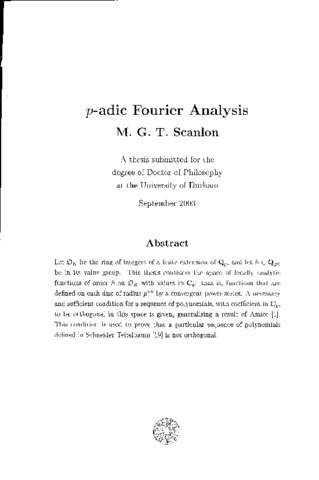 Let Dk be the ring of integers of a finite extension of Q(_p), and let h ɛ Q≥(_0) be in its value group. This thesis considers the space of locally analytic functions of order h on Ok with values in Cp-. that is, functions that are defined on each disc of radius by a convergent power series. A necessary and sufficient condition for a sequence of polynomials, with coefficient in C(_p), to be orthogonal in this space is given, generalising a result of Amice [1] . This condition is used to prove that a particular sequence of polynomials defined in Schneider Teitelbaum [19] is not orthogonal.