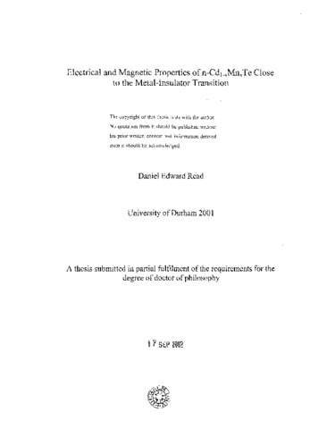Electrical transport and magnetic measurements have been made on n-Cd(_1-x)Mn(_x) Te (0.047 < X < 0.197) for samples doped with hi or In,Al. Results are presented for measurements made as a function of temperature (40 mK < T < 300 K), applied magnetic field (0 T < B < 6 T) and photogenerated carrier density. Low field magnetic susceptibility measurements have identified a transition from a paramagnetic phase to a spin glass phase at low temperatures. The measured temperature dependence of the magnetic susceptibility is consistent with a cluster glass model. Measurements of the spin glass freezing temperature have been carried out on four samples having different Mn fractions The results obtained are in agreement with the limited number of previous measurements on nominally undoped samples. At low temperatures photo-induced changes in magnetism have been measured in both the paramagnetic and the spin glass phase. The change in magnetisation on illumination is due to an increased number of bound magnetic polarons formed around quasi localised s-spins. High temperature susceptibility measurements have been used to examine the parameters characterising the paramagnetic phase, and their variation with Mn fraction. Electrical transport measurements at very low temperatures (T < 800 mK) have shown a strong temperature dependent electron localisation. This has resulted in the confirmation of insulating behaviour in a sample (x = 0.047) having n. At low temperatures and in zero field an activated form of the conductivity is observed. In applied magnetic fields (B > 50 mT) Efros-Shklovskii variable range hopping is observed in the insulating phase. These results are attributed to the formation of a hard gap in the density of states, having a magnetic origin. At higher fields an insulator-metal phase transition occurs. In the metallic phase the conductivity can be described by a quantum correction to the zero temperature conductivity due to the effect of electron-electron interactions. Results obtained before and after illumination are consistent with scaling theory of electron localisation, having a critical exponent close to unity, indicative of the importance of electron-electron interactions. A reduction in the value of the critical field is seen after increasing the carrier density (B(_c) = 2.0 and 1.3 T for n = 3.3 xl0(^17)cm(^-3) and 3.8 x10(^17) cm(^-3) respectively).At low temperatures an anisotropy in the resistivity has been measured for samples in the spin glass phase. Magnetoresistance measurements have shown results consistent with previous measurements, in addition to a large, low field component that is attributed to the effect of magnetic field on electrons in the variable range hopping regime.