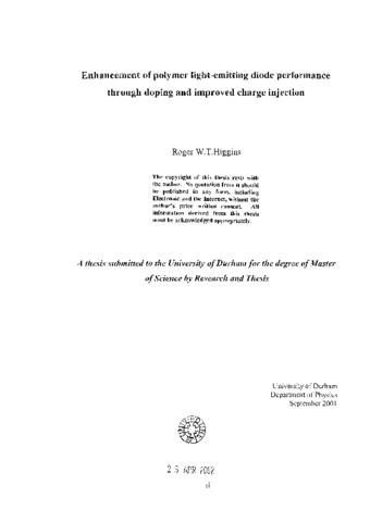 Research into the performance enhancement of polymer light-emitting diodes, through techniques of doping and improved charge injection, is reported. Initial electroluminescent (EL) characterisation of all host polymers used; in particular poly(2-methoxy-5-(2'-ethyl-hexyloxy)-1,4-phenylene vinylene) (MEH-PPV) and α,ω-Bis[N,N-di(4-methylphenyl)aminophenyl]-poly(9,9-bis(2-ethylhexyl)fluoren-2,7-diyl) (PF2/6am4) in both mono- and bi-layer configuration is presented. For all studies indium tin oxide was used as the primary anode, with either aluminium or calcium as the cathode. The polymers are all soluble and were processed from spin coating to produce films of order 100 namometres in thickness. A range of protonated polyaniline thin films are characterised for use as hole-transporting layers (HTLs) with MEH-PPV. The HTL fermi level is found to be crucial to its effectiveness in facilitating hole injection. Following this the published studies of PF2/6am4 doping with highly efficient dopants (Rubrene and three metal-porphyrin derivatives) are presented. Techniques summarised in chapter 3 are used in order to convert the measured light output into optical units of candela per metre squared and lumens per watt. The external quantum efficiency for each configuration fabricated is also calculated. Previously reported studies of the dopants are used in order to aid discussion as to the key properties that make a dopant suitable for use in donor: acceptor systems. It is noted that the dopants' excited state lifetime is directly related to the current density at which peak performance is observed, and it is recommended that in order to avoid dopant saturation the dopants' excited state lifetime should be as small as possible without sacrificing emission efficiency. Having established the considerable challenges to be overcome for energy transfer systems to be commercially viable, an alternative doping technique is presented: host perturbation. First the effect of doping both MEH-PPV and PF2/6am4 with a range of rare earth lanthanide metal: organic complexes is investigated. The effect on the inter system crossing is observed to be highly host dependent, with improvements in efficiency only for MEH-PPV. These results are compared with theoretical predictions. In all studies we draw comparison from similar studies carried out by other groups where possible.