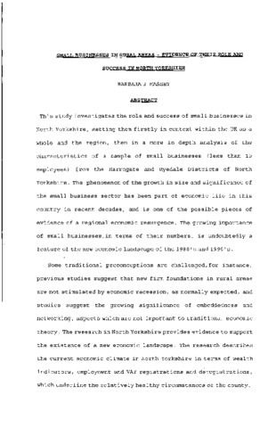 This study investigates the role and success of small businesses in North Yorkshire, setting them firstly in context within the UK as a whole and the region, then in a more in depth analysis of the characteristics of a sample of small businesses (less than 10 employees) from the Harrogate and Ryedale Districts of North Yorkshire. The phenomenon of the growth in size and significance of the small business sector has been part of economic life in this country in recent decades, and is one of the possible pieces of evidence of a regional economic resurgence. The growing importance of small businesses, in terms of their numbers, is undoubtedly a feature of the new economic landscape of the 1980 ' s and 1990 ' s .Some traditional preconceptions are challenged, for instance, previous studies suggest that new firm foundations in rural areas are not stimulated by economic recession, as normally expected, and studies suggest the growing significance of embeddedness and networking, aspects which are not important to traditional economic theory. The research in North Yorkshire provides evidence to support the existence of a new economic landscape. The research describes the current economic climate in North Yorkshire in terms of wealth indicators, employment and VAT registrations and deregistrations, which underline the relatively healthy circumstances of the county. In the second part of the study, based on a survey of small businesses, the particular characteristics of small businesses, including their location, their longevity and reasons for their establishment are examined. The typical small business was found to be a 'niche ' type service, established on the outskirts of a village or small market town, typically in home premises, established there for an average of around 11 years, and set up after voluntarily leaving employment, not redundancy. Many of the founders were qualified and a moderate level of technology was used in the business. There was firm evidence of local embeddedness and informal networking, though little or no evidence of agency assistance and formal networking, such as membership of business associations. The various characteristics were exhaustively cross - tabulated to further determine the characteristics of the sampled firms. Finally, the results of the sample survey were compared and contrasted with previous studies in the field of small business characteristics, particularly recent studies of small businesses in rural areas, and the results generally conformed to the patterns - there is a new economic landscape where countless small businesses play a small but significant role, perhaps a more static role in North Yorkshire than is commonly supposed.