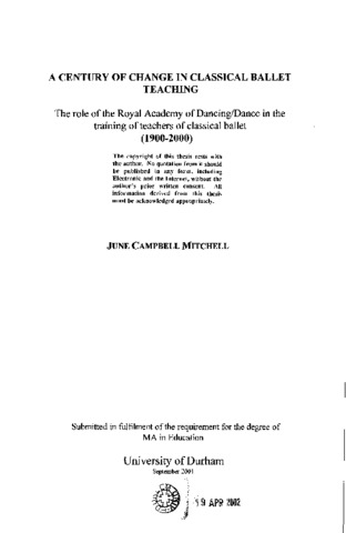 A century of change in classical ballet teaching: the role of the Royal Academy of dancing/dance in the training of teachers of classical ballet (1900-2000)