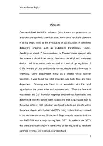 Commercialised herbicide safeners (also known as protectants or antidotes) are synthetic chemicals used to enhance herbicide tolerance in cereal crops. They do this by causing an up-regulation in xenobiotic detoxifying enzymes such as glutathione transferases (GSTs). Seedlings of wheat (Triticum aestivum cv ‘Einstein’) were sprayed with the safeners cloquintocet mexyl, fenchlorazole ethyl and mefenpyr diethyl. All three compounds caused an identical up regulation of GSTs from the phi, tau and lambda classes, despite their differences in chemistry. Using cloquintocet mexyl as a classic wheat safener treatment, it was found that GST induction was both dose and time dependent. Safening was found to be associated with the rapid hydrolysis of the parent ester to cloquintocet acid. When the free acid was tested, the GST-induction response obtained was identical to that determined with the parent ester, suggesting that cloquintocet itself is the active safener. GST induction was found to be tissue specific within the wheat shoots, with the lambda GSTs being preferentially expressed in the meristematic tissue. Proteomic 2 D gel analysis revealed that the tau TaGSTU3 was a major up-regulated GST. In addition, six GSTs that were previously shown in literature to be up-regulated by herbicide safeners in wheat were cloned, expressed and characterized as the respective recombinant enzymes and renamed to bring them in line with existing nomenclature. The GSTs cloned included TaGSTU3, TaGSTU6, TaGSTF4, TaGSTF10 and TaGSTL1. Metabolism studies showed that following the hydrolysis of cloquintocet mexyl, no further down- stream metabolites could be identified and none of the up-regulated GSTs showed any activity toward the safener. However TaGSTU3 was found to bind and be inhibited by cloquintocet free acid as determined by isothermal titration calorimetry. Safener treatment also led to a transient inhibition of GST activity in crude wheat extracts after spraying the seedlings. In addition to the induction of GSTs, safener treatments also resulted in an enhanced growth of wheat seedlings. The work presented in this thesis confirms that very different compounds can induce apparently identical downstream events at the level of GST enhancement and that these induction events underpin wider changes in plant physiology.