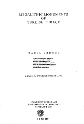 Thracian megalithic monuments are confined to parts of east and south-east Bulgaria, north east Greece and Turkish Thrace. They are located on the Istranca, Sakar and Rhodopes Mountains. On the basis of artefacts discovered at the dolmens and tumuli in western and eastern Thrace, Thracian megalithic monuments date to the Early Iron Age, between around the 11th and 8th centuries ВС. Prehistoric monuments laid claim to land through the legitimating of ancestors and their use for communal ceremonies. The megalithic monuments of Turkish Thrace have been known since the 19th century AD. Locating and recording of the dolmens was the main goal of early researchers and so little attention was paid to standing stones complexes and other megalithic monuments in Turkish Thrace. My research was conducted as a regional survey with the aim of examining both the geographical distribution of the full range of megalithic monuments, especially the standing stone complexes, and also intensive surveys were conducted in the Istranca Mountains of the Edime Region. A number of interpretations have been offered by many researchers about megalithic monuments in general, such as symbolic meaning of complexes, patterns of intervisibility, location, astronomy and ritual of complexes. All these ideas were examined with reference to the Turkish Thrace megaliths. All of the standing stone complexes in Turkish Thrace contain multiple stone rows and lie in a รพ-NE direction, aligned on the mid-winter sunset. In particular the standing stone rows in Turkish Thrace may have been intended for sequential processions. A procession can be realised through groups of people moving in an orderly and directional manner. Processions are ceremonial in character, taking place to mark an event or to enact a ritual.