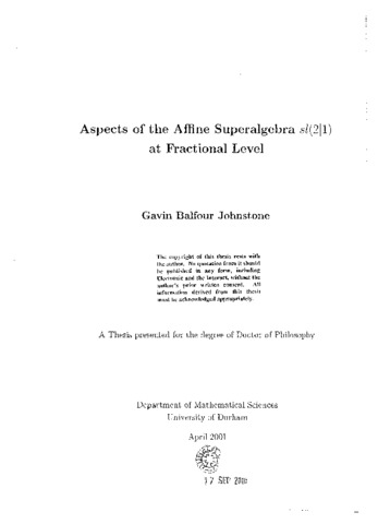 Aspects of the Affine Superalgebra sl(2|l) at Fractional Level Ph.D. Thesis by Gavin Balfour Johnstone, April 2001 In this thesis we study the affine superalgebra sl(2|l; C) at fractional levels of the form k = l/u-l,uєNl}. It is for these levels that admissible representations exist, which transform into each other under modular transformations. In the second chapter we review background material on conformal field theory, particularly the Wess-Zumino-Witten model and the connection with modular transformations. The superalgebra sl(2|l;C) is introduced, as is its affine version. The next chapter studies the modular transformation properties of sl(2|l;C) characters. We derive formulae for these transformations for all levels of the form K = 1/u-1,uєN