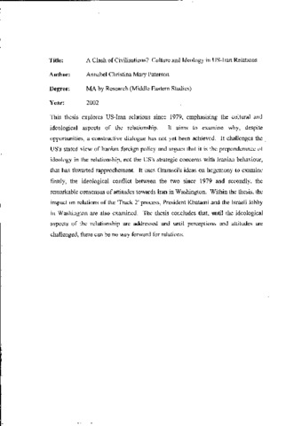 This thesis explores US-Iran relations since 1979, emphasising the cultural and ideological aspects of the relationship. It aims to examine why, despite opportunities, a constructive dialogue has not yet been achieved. It challenges the US's stated view of Iranian foreign policy and argues that it is the preponderance of ideology in the relationship, not the US's strategic concerns with Iranian behaviour, that has thwarted rapprochement. It uses Gramsci's ideas on hegemony to examine firstly, the ideological conflict between the two since 1979 and secondly, the remarkable consensus of attitudes towards Iran in Washington. Within the thesis, the impact on relations of the 'Track 2' process. President Khatami and the Israeli lobby in Washington are also examined. The thesis concludes that, until the ideological aspects of the relationship are addressed and until perceptions and attitudes are challenged, there can be no way forward for relations.