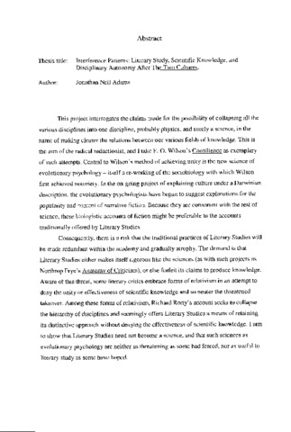 This project interrogates the claims made for the possibility of collapsing all the various disciplines into one discipline, probably physics, and surely a science, in the name of making clearer the relations between our various fields of knowledge. This is the aim of the radical reductionist, and I take E. O. Wilson's Consilience as exemplary of such attempts. Central to Wilson's method of achieving unity is the new science of evolutionary psychology - itself a re-working of the sociobiology with which Wilson first achieved notoriety. In the on-going project of explaining culture under a Darwinian description, the evolutionary psychologists have begun to suggest explanations for the popularity and content of narrative fiction. Because they are consonant with the rest of science, these biologistic accounts of fiction might be preferable to the accounts traditionally offered by Literary Studies. Consequently, there is a risk that the traditional practices of Literary Studies will be made redundant within the academy and gradually atrophy. The demand is that Literary Studies either makes itself rigorous like the sciences (as with such projects as Northrop Frye's Anatomy of Criticism), or else forfeit its claims to produce knowledge. Aware of this threat, some literary critics embrace forms of relativism in an attempt to deny the unity or effectiveness of scientific knowledge and so neuter the threatened takeover. Among these forms of relativism, Richard Rorty's account seeks to collapse the hierarchy of disciplines and seemingly offers Literary Studies a means of retaining its distinctive approach without denying the effectiveness of scientific knowledge. I aim to show that Literary Studies need not become a science, and that such sciences as evolutionary psychology are neither as threatening as some had feared, nor as useful to literary study as some have hoped.