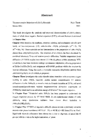 This thesis investigates the synthesis and structural characterisation of AM(_2)O(_8) phases, many of which show negative thermal expansion (NTE); relevant literature is reviewed in Chapter One. Chapter Two describes the synthesis, structure solution, and mechanistic role of a new family of low-temperature (LT) orthorhombic AM(_2)O(_8) polymorphs (A(^TV) = Zr, Hf; M(^VI) = Mo, W). These materials are key intermediates in the preparation of cubic AM(_2)O(_8) phases from AM(_2)O(_7)(OH)(_2)(H(_2)O)(_2). The structure of LT-AM(_2)O(_8) has been elucidated by combined laboratory X-ray and neutron powder diffraction. Variable temperature X-ray diffraction (VTXRD) studies have shown LT- AM(_2)O(_8) phases exhibit anisotropic NTE. LT-ZrMo(_2)O(_8) has been shown to undergo spontaneous rehydration, allowing preparation of ZrMo(_2)O(_7)(OD)(_2)(D(_2)O)(_2) and assignment of D(_2)O/OD positions within the structure by neutron diffraction. Using this result, a reversible topotactic dehydration pathway from AM(_2)O(_7)(OH)(_2)(H(_2)O)(_2) to LT-AM(_2)O(_8)s is proposed.Chapter Three investigates the order-disorder phase transition with concurrent oxygen mobility in cubic AM(_2)O(_8) materials; studies include comprehensive VT neutron diffraction of cubic ZrMo(_2)O(_8) to reveal a static to dynamic transition at 215 K, and novel quench-anneal/quench-warm variable temperature/time diffraction experiments on ZrMo(_2)O(_8) which lead to an activation energy of 40 kJmol(^-1) for oxygen migration. In Chapter Four (^17)O-labelled cubic ZrW(_2)O(_8) has been prepared to understand the oxygen migration process by VT MAS NMR. In situ hydrothermal studies of cubicZrMo(_2)O(_8) using synchrotron radiation have shown direct hydration to ZrMo(_2)O(_7)(OH)(_2)(H(_2)O)(_2).. In Chapter Five VTXRD of trigonal a-AMo(_2)O(_8) phases reveals a previously unknown second-order phase transition at 487 K (A = Zr) or 463 K (A = Hf) from P31c to P3ml. Rigid-body Rietveld refinements have shown this is due to alignment of apical Mo-O groups with the c axis in the high-temperature, a' phase.