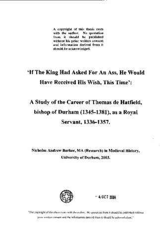 'If the king had asked for an ass, he would have received his wish, this time: a study of the career of Thomas de Hatfield, bishop of Durham (1345-1381), as a royal servant, 1336-1357.