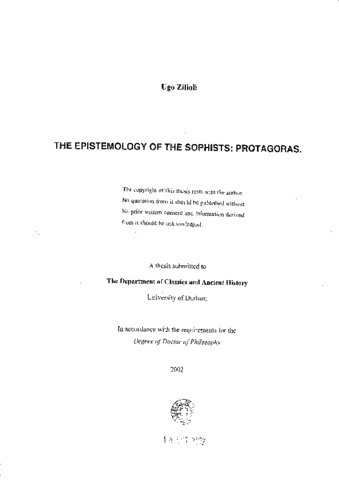 My thesis is on the epistemology of the sophist Protagoras. Through the reading of Plato' Theaetetus and Protagoras, I have reconstructed (a) Protagorean theory of knowledge, according to which Protagoras is an inter-subjectivist (as far as perceptions are concerned) and a moral relativist (as far as ethical judgements are concerned).In Chapter 1,1 first try to reconstruct the development of Protagoras' life. I list then Protagoras' few (extant) fragments, offering their different interpretations. Lastly, I deal with modern and most recent scholarship on Protagoras, ending the chapter with some considerations about the scholarly legitimacy of my thesis. In chapters 2 and 3, I deal with the Protagorean section in Plato's Theaetetus. Through a detailed (and critical) analysis of Plato's exegesis of Protagoras' maxim "Man is the measure of all things", I first reconstruct the perceptual (and individualistic) side of Protagoras' epistemology and then the ethical (and collective) side of such an epistemology. At the end of chapter 3, Protagoras' theory of knowledge already reveals itself as a rather complete epistemology. Such a (complete) picture of Protagoras' epistemology is reinforced in chapter 4, which deals with the Great Speech (mainly the myth) of the Protagoras. Through a close analysis of the core of the Great Speech, I confirm the ethical and collective reading of Protagoras' maxim that I have given in chapter 3. I end the chapter by providing some (modern) suggestions for taking Protagoras as a more serious epistemologist than he is actually thought of In the Conclusion, I sum up my whole reconstruction of the Platonic Protagoras and of his theory of knowledge, connecting it briefly with some features of fifth-century B.C Greek epistemology and, again, with some modern philosophical tenets.