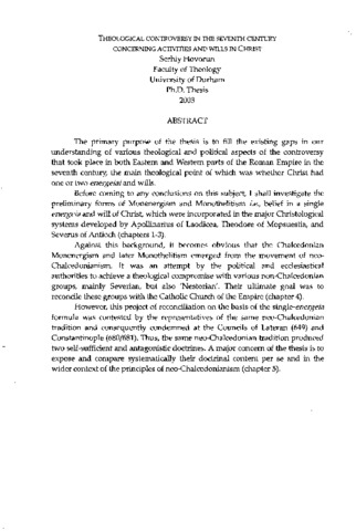 The primary purpose of the thesis is to fill the existing gaps in our understanding of various theological and political aspects of the controversy that took place in both Eastern and Western parts of the Roman Empire in the seventh century, the main theological point of which was wether Christ had one or two energeiai and wills. Before coming to any conclusions on this subject, I shall investigate the preliminary forms of Monenergism and Monothelitism i.e., belief in a single energeia and will of Christ, which were incorporated in the major Christological systems developed by Apollinarius of Laodicea, Theodore of Mopsuestia, and Severus of Antioch (chapters 1-3).Against this background, it becomes obvious that the Chalcedonian Monenergism and later Monothelitism emerged from the movement of neo- Chalcedonianism. It was an attempt by the political and ecclesiastical authorities to achieve a theological compromise with various non-Chalcedonian groups, mainly Severian, but also 'Nestorian'. Their ultimate goal was to reconcile these groups with the Catholic Church of the Empire (chapter 4). However, this project of reconciliation on the basis of the single-energeia formula was contested by the representatives of the same neo-Chalcedonian tradition and consequently condemned at the Councils of Lateran (649) and Constantinople (680/681). Thus, the same neo-Chalcedonian tradition produced two self-sufficient and antagonistic doctrines. A major concern of the thesis is to expose and compare systematically their doctrinal content per se and in the wider context of the principles of neo-Chalcedonianism (chapter 5).