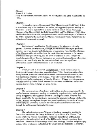 Chapter 1For decades, many critics assumed Edith Wharton's post-World War I fiction to be valuable only in the shadow of her earlier, and supposedly greater, writing. In this thesis, I intend to explore three of these novels in further critical detail. The Glimpses of the Moon (1922), Twilight Sleep (1927), and The Children (1928). Their combination allows for a solid, comprehensive and multifaceted sample of Wharton in the 1920s. Integral to this thesis are the Marxist reasoning of Fredric Jameson and the utilisation of his semantic rectangle. Chapter 2At the time of its publication The Glimpses of the Moon was critically ignored. However, the exploration, at length, of the semantic rectangles produced from this novel has directed us to four points of conclusion. First, that The Glimpses of the Moon provides a transition from the tragic historical romance to the modern problematic lifestyle. Secondly, that the novel is displaced in time. Thirdly, the knowledge gained from this new exploration has worth at least equal to novels written prior to 1920. And finally, that the conclusion of this novel has significant ambivalence hidden within the neatness of the resolution. Chapter 3Wharton's task in this novel, Twilight Sleep, is much more to act as an illustrator of the ambivalence that marked the later 1920s. Each incarnation of the binary between power and subordination reveals a separate area of uncertainty and two dichotomous manners of resolving it. What follows from them is an intense inability or refusal to endorse any of them by Wharton. Without providing answers, Wharton equitably divides failure between the characters and binaries. Rather than success, this novel and rectangle are about failure. Chapter 4The warring notions of modernity and tradition produced, pragmatically, the conflict between change and stability. As modernity crept into being, social guidelines slowly disappeared, leaving people awash in a sea of possibilities. Wharton was deeply troubled by the uncertainty and transience that characterised once solid worlds. In The Children, she explores the questions posed by debating the merits of change and stability and ultimately expresses her inability to come to terms with either through the ambivalence that marks this novel. Chapter The body of contemporary Wharton critics have managed to identify the factors that precipitated the change in Wharton's post-World War I fiction. This thesis, employing Marxist critic Fredric Jameson's methodology and tools, has attempted to show the critical worth of the 1920s works through examining three selections. Jameson's ability to merge historicism, ideology, criticism and philosophy extends into a synthesized methodology for literary critique applicable to Wharton.
