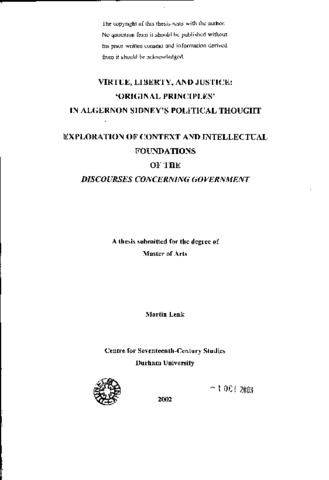Virtue, liberty, and justice: ‘original principles’ in Algernon Sidney’s political thought exploration of context and intellectual foundations of the discourses concerning government