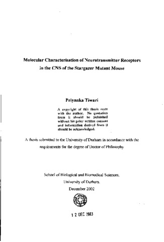 The mutant mouse stargazer shows both ataxia and absence epilepsy from P14 onwards. A PGR amplification strategy was utilised to identify adult (i.e. > 3 months) +/stg from +/+ mice, which share the same phenotype, for use for breeding purposes. The same technique was employed to identify +/+, +/stg and stg/stg neonates (i.e. < 7 days old) for cell culture purposes, since the stargazer phenotype is not apparent at this age. GABA(_A) receptor α(_6) subunit expression levels were significantly decreased in adult stargazer (stg/stg) cerebella when compared to control (+/+ and +/stg) cerebella. Interestingly, autoradiography using [(^3)H] Ro15-4513 revealed an apparent upregulation in α(_4)γ-containing receptors in the adult stargazer dentate gyrus. No significant differences in the expression of NMDAR subunits were detected between adult control and stargazer brain membranes. A significant decrease was observed in AMPAR subunit expression within the adult stargazer cerebellum, particularly with the GIuR2 subunit, which was reduced by 73 %. This decrease was replicated in cerebellar granule cells cultured from stargazer neonates, which also expressed at the cell surface only 18 % of the total GluR2 found in control granule cells. Inmunohistochemistry analyses using mouse anti-stargazin antibodies revealed stargazin to be found throughout the adult control brain, with highest levels of expression being within the hippocampus and cerebellum. Stargazin protein, however, was not expressed in adult stargazer forebrain nor in adult stargazer cerebellar membranes. Finally, immunoaffinity columns using the anti-stargazin antibodies were prepared and demonstrated that stargazin could be purified from adult control mouse brain extracts. Moreover, AMPAR subunits co-immunoprecipitated, indicating an association in vivo.