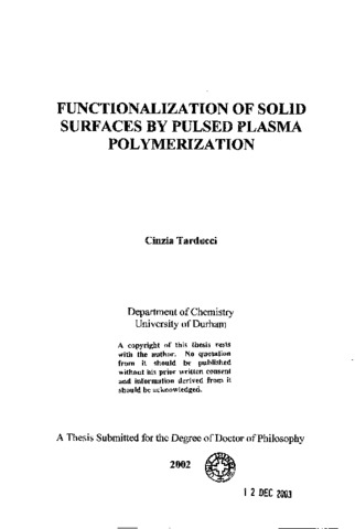 Pulsed plasma polymerization provides a direct method for the functionalization of solid surfaces. Compared to low power continuous wave plasma conditions, it provokes very little monomer fragmentation and leads to high levels of structural retention. The monomers investigated in this thesis contained a polymerizable double bond and either a perfluoro, epoxide, cyano, hydroxyl or furan functionality. Under pulsed conditions activation of the double bond occurs during the time on period and conventional intermolecular propagation reactions occur during the time off. In the case of dienes, cyclic structures are formed, via intramolecular propagation. The plasma polymers were investigated using X-ray photoelectron, infrared, ultraviolet/visible and secondary ion mass spectroscopies, nuclear magnetic resonance, contact angle and gel permeation chromatography. Epoxide and hydroxyl functionalized solid surfaces could be further functionalized via conventional chemistry reactions. Furan functionalized solid surfaces were capable of undergoing Diels-Alder reactions. The cyano functionalized layers were found to readily complex silver ions from solution. Epoxide and cyano functionalized surfaces exhibited adhesive behavior.