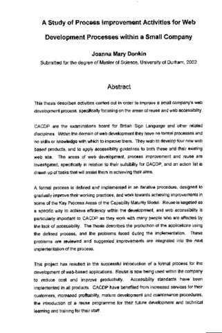 This thesis describes activities carried out in order to improve a small company's web development process, specifically focusing on the areas of reuse and web accessibility. CACDP are the examinations board for British Sign Language and other related disciplines. Within the domain of web development they have no formal processes and no skills or knowledge with which to improve them. They wish to develop four new web based products, and to apply accessibility guidelines to both these and their existing web site. The areas of web development, process Improvement and reuse are investigated, specifically In relation to their suitability for CACDP, and an action list is drawn up of tasks that will assist them in achieving their aims. A formal process is defined and implemented in an iterative procedure, designed to gradually improve their working practices, and work towards achieving improvements in some of the Key Process Areas of the Capability Maturity Model. Reuse is targeted as a specific way to achieve efficiency within the development, and web accessibility is particularly important to CACDP as they work with many people who are affected by the lack of accessibility. The thesis describes the production of the applications using the defined process, and the problems faced during the implementation. These problems are reviewed and suggested improvements are integrated into the next implementation of the process. This project has resulted in the successful introduction of a formal process for the development of web-based applications. Reuse is now being used within the company to reduce cost and improve productivity. Accessibility standards have been implemented in all products. CACDP have benefited from increased services for their customers, increased profitability, mature development and maintenance procedures, the introduction of a reuse programme for their future development and technical learning and training for their staff.